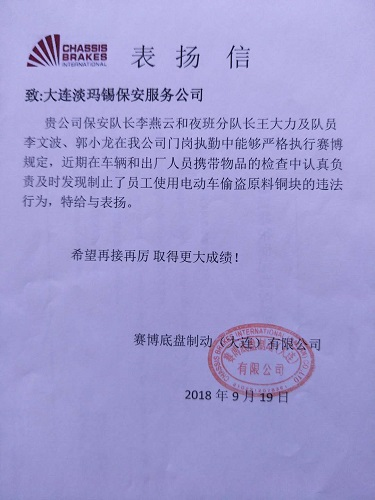 2018年9月19日,我公司駐賽博底盤制動(大連)有限公司隊長及值班隊員因執(zhí)勤中嚴(yán)格遵守賽博規(guī)定,在對出廠車輛和人員的檢查中發(fā)現(xiàn)員工偷盜銅塊原料的行為并及時加以制止,維護(hù)了廠區(qū)的制度尊嚴(yán)和利益。
