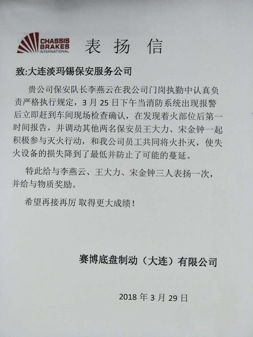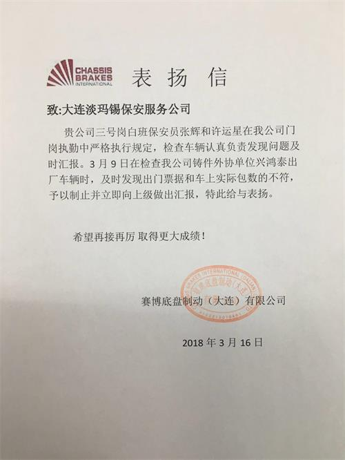 我公司分別于2018年3月16日和2018年3月29日收到賽博底盤制動(大連)有限有公司的表揚信。